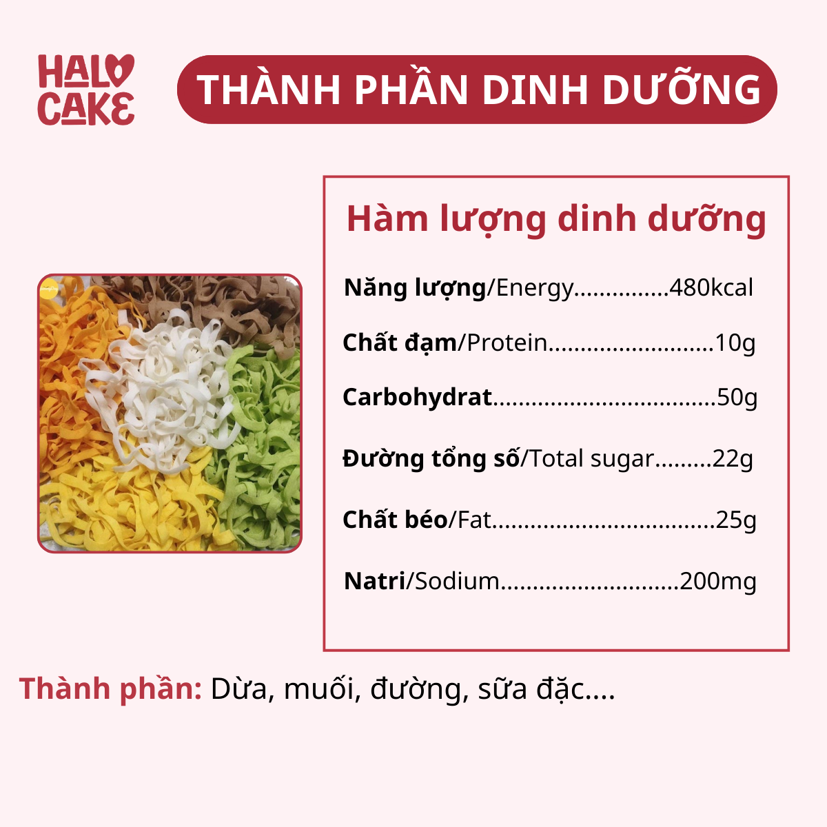 – Hương vị béo thơm từ Dừa kết hợp với Đường và Sữa đặc theo công thức chuẩn.